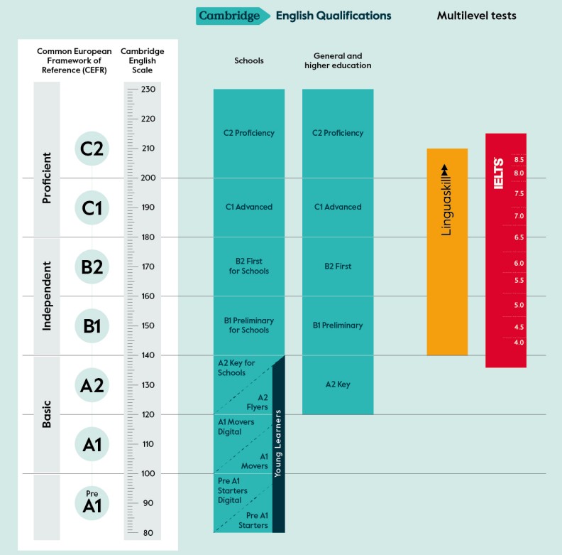 Todos los exámenes de Cambridge están alineados al Marco Común Europeo de Referencia (CEFR, del inglés Common European Framework of Reference) y la Cambridge English Scale. El MCER es un estándar internacional para describir la competencia lingüística. Describe la competencia lingüística mediante una escala de seis puntos, desde A1 para principiantes hasta C2 para aquellos que han logrado el dominio de un idioma.