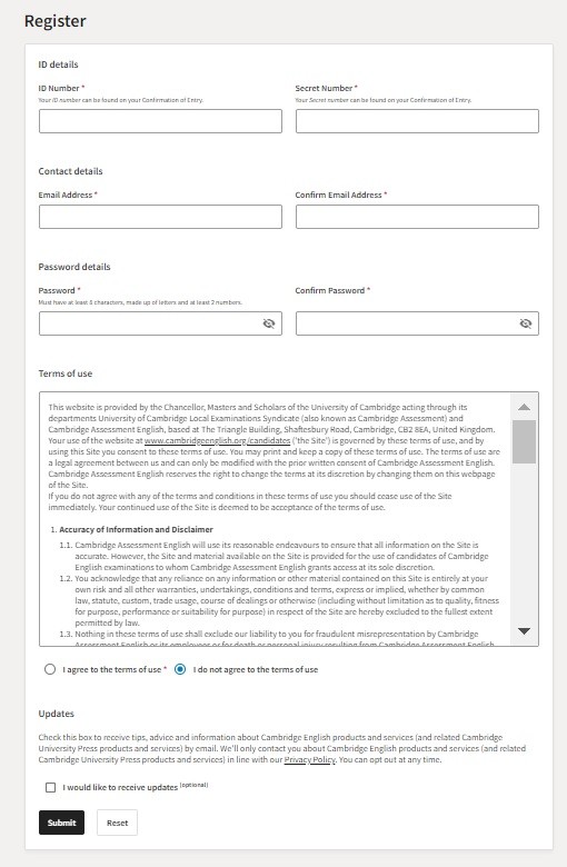 Podés marcar el casillero de 'Updates' para recibir consejos e información de Cambridge English por mail. Por último, hacé clic en el botón 'Submit' para terminar el registro.